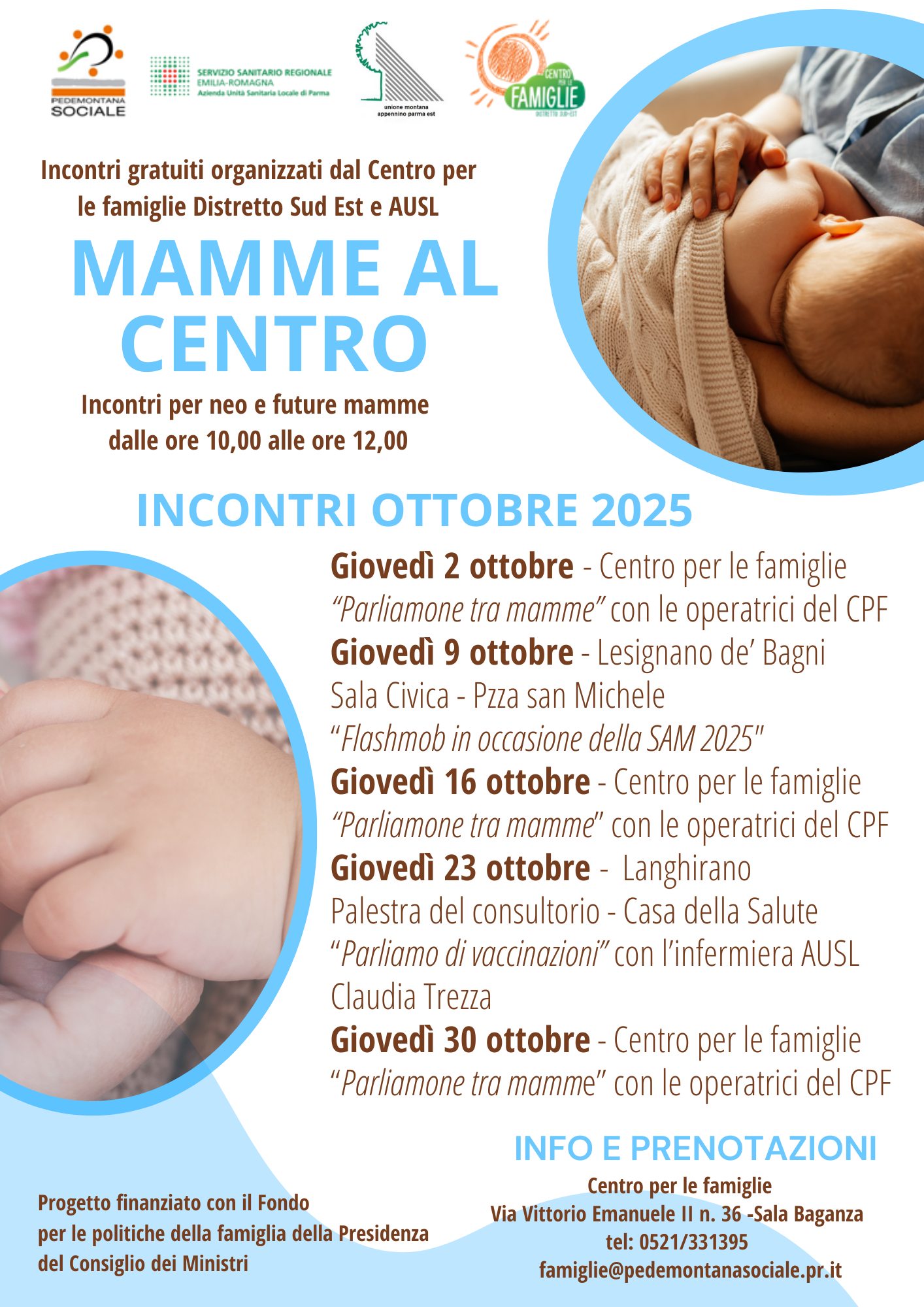 Il 2 il 16 e il 30 ottobre ci saranno gli appuntamenti “Parliamone tra mamme” con le operatrici del CPF al Centro per le Famiglie, mentre il 23 ottobre al Consultorio di Langhirano (c/o Casa della Salute – Via Roma 42/1) si parlerà di vaccinazioni con l’infermiera dell’Ausl Claudia Trezza.