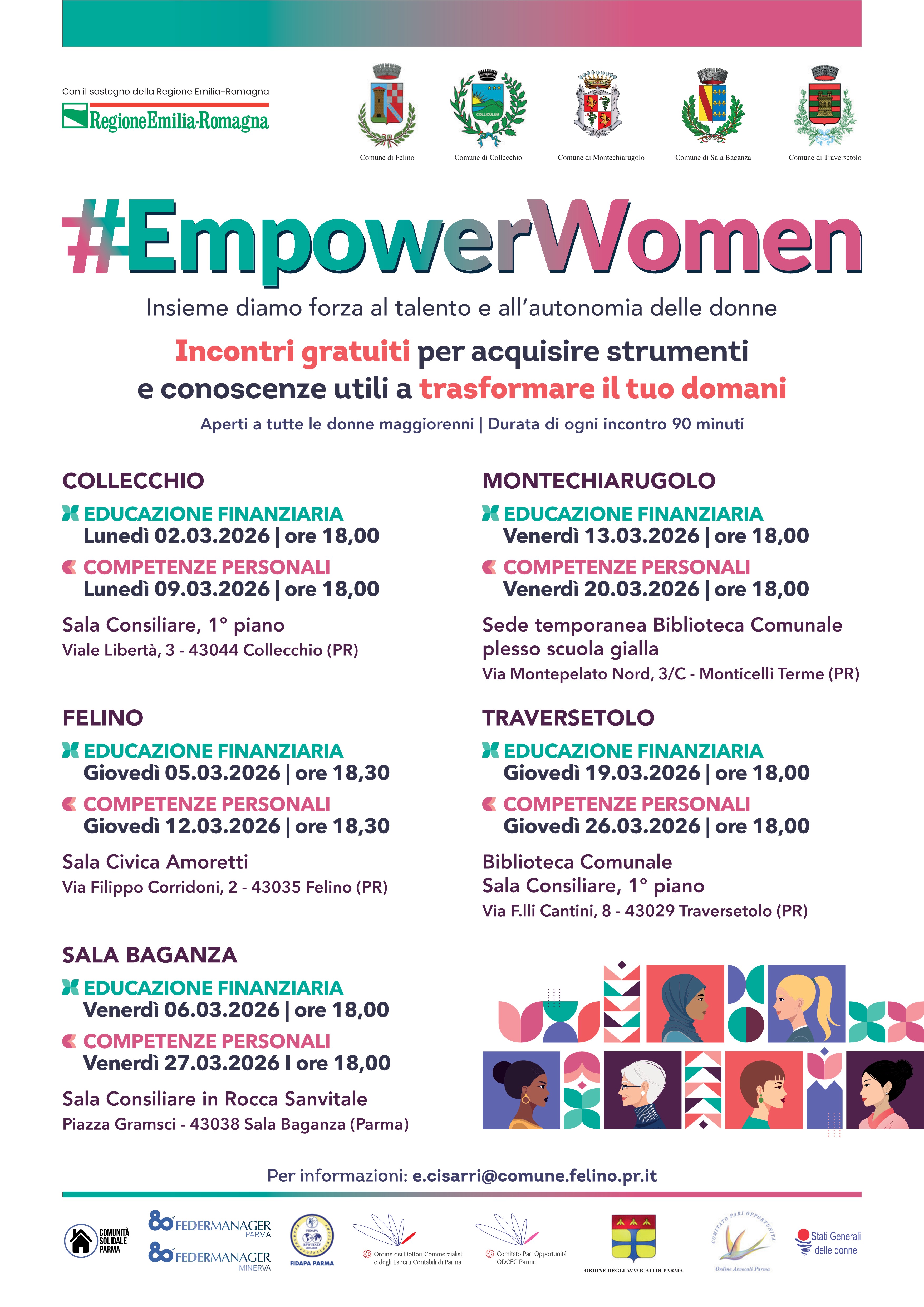 Favorire la presenza paritaria delle donne nel mondo del lavoro e nella vita economica, fornendo loro strumenti concreti per l’autonomia e la crescita professionale. Con questo obiettivo nasce #EmpowerWomen, il progetto ai nastri di partenza rivolto alle donne over 18 residenti nei cinque comuni dell’Unione Pedemontana Parmense (Collecchio, Felino, Montechiarugolo, Sala Baganza e Traversetolo).