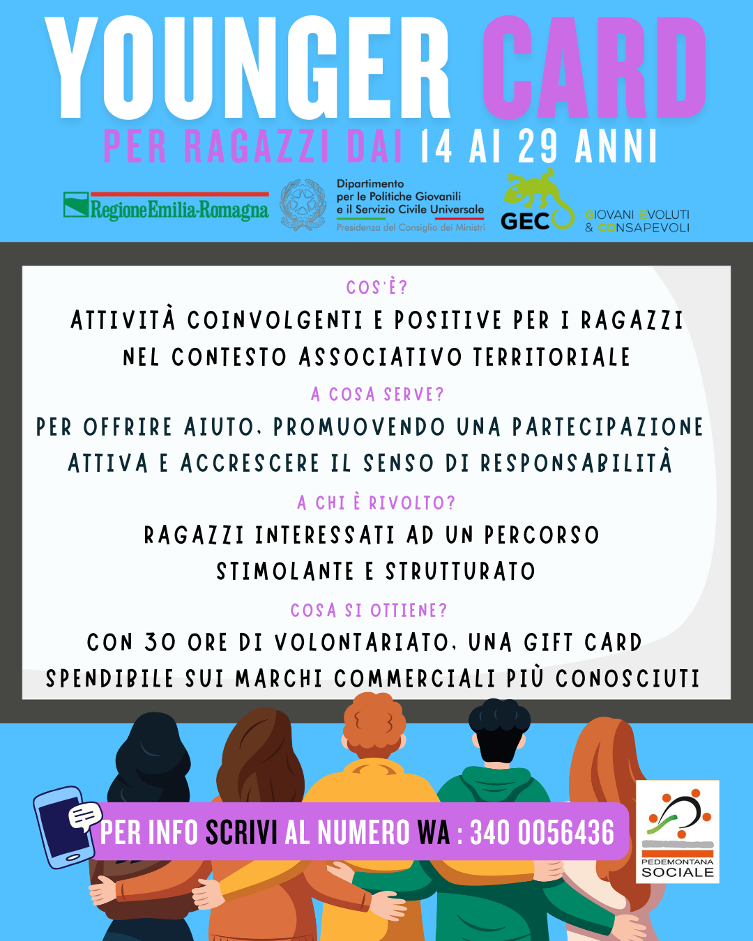 L’iniziativa, organizzata da Azienda Pedemontana Sociale, rientra nelle azioni della YoungERcard e nel piano operativo “GECO 14 - Giovani Evoluti e Consapevoli” - finanziato dalla Presidenza del Consiglio dei Ministri con delega in materia di Politiche giovanili - Servizio civile universale e dalla Regione Emilia-Romagna - e offre ai giovani l’opportunità di prestare, indicativamente, 30 ore di volontariato nelle associazioni, negli Enti del Terzo Settore e nelle biblioteche del territorio. In cambio del loro tempo e delle loro energie, riceveranno una gift card da 100 euro spendibili sui marchi commerciali più conosciuti.