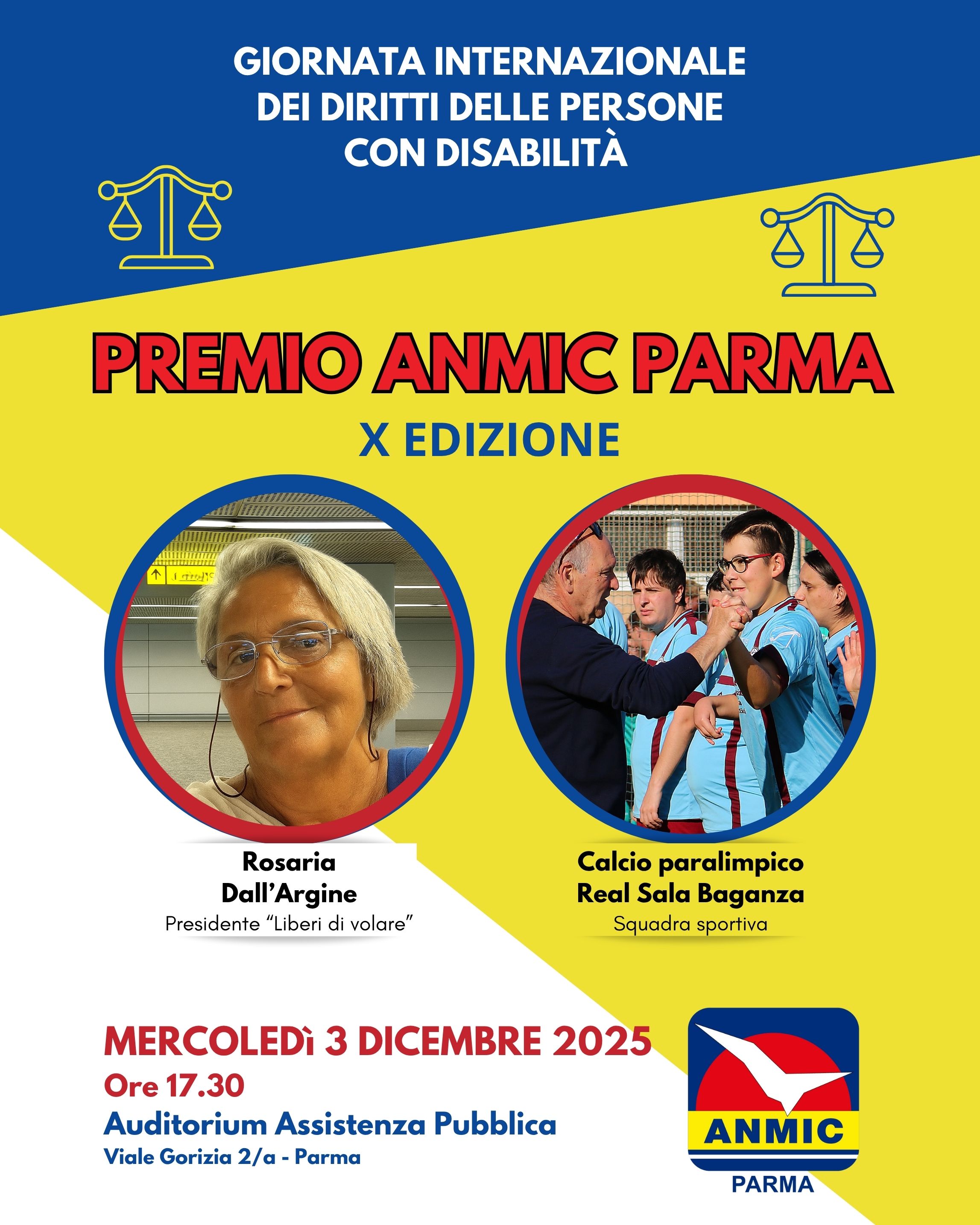 Premio Anmic Parma: la Pedemontana fa l’en plein. I due prestigiosi riconoscimenti, che da un decennio vengono assegnati a persone e realtà che hanno accresciuto il valore culturale, sociale, civile della nostra comunità, grazie alle proprie azioni sul fronte dei diritti e dell’inclusione delle persone con disabilità, saranno infatti consegnati a Rosaria Dall’Argine, presidente dell’associazione “Liberi di Volare”, e alla squadra di calcio paralimpico del Real Sala Baganza.