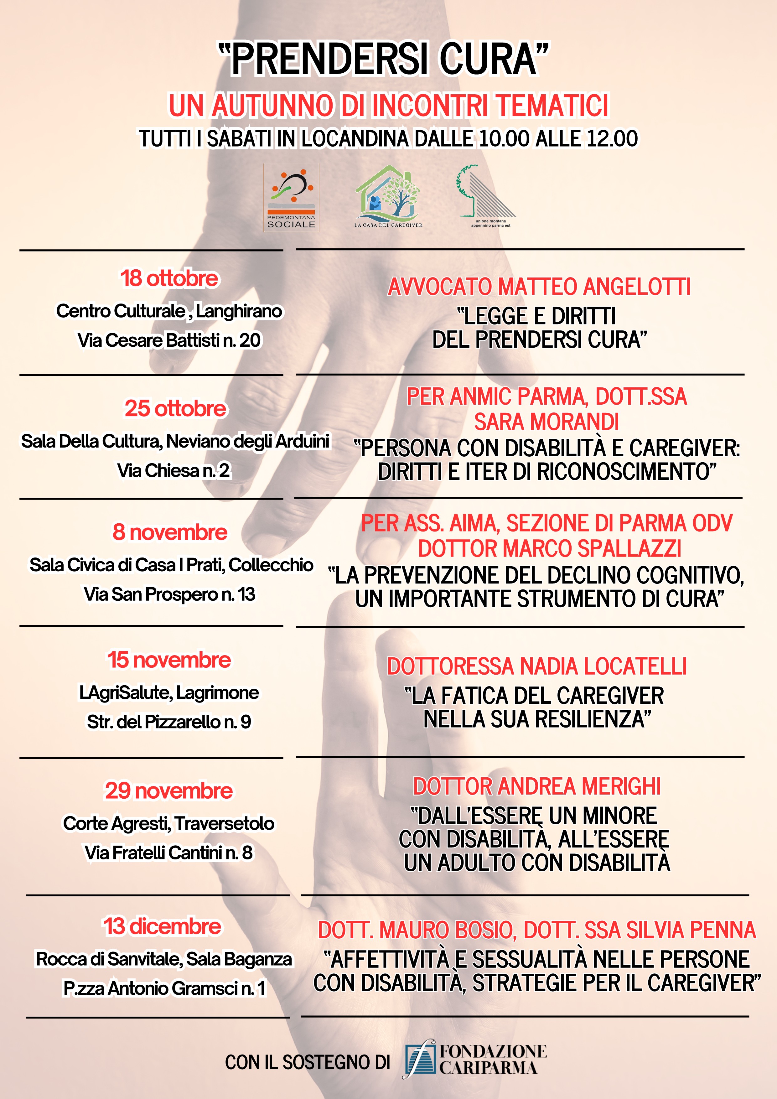A novembre il primo appuntamento è in programma sabato 8 nella Sala civica di Casa I Prati a Collecchio (Via San Prospero, 13) con il presidente della sezione di Parma di AIMA (Associazione Italiana Malattia di Alzheimer), dottor Marco Spallazzi, che interverrà sul tema "La prevenzione del declino cognitivo, un importante strumento di cura”. Il 15 novembre si salirà a Lagrimone, dove nella sede di LAgriSalute (Strada del Pizzarello, 9) si parlerà de "La fatica del caregiver nella sua resilienza” con la dott.ssa Nadia Locatelli. Il 29 novembre si scenderà nuovamente in Pedemontana, alla Corte Agresti di Traversetolo (Via F.lli Cantini, 8) per l’incontro “Dall’essere un minore con disabilità, all’essere un adulto con disabilità” con il dottor Andrea Merighi. A chiudere il calendario, sabato 13 dicembre nella Sala convegni della Rocca Sanvitale di Sala Baganza (P.zza Gramsci, 1) saranno il dottor Mauro Bosio e la dott.ssa Silvia Penna che tratteranno il tema “Affettività e sessualità nelle persone con disabilità, strategie per il caregiver”.
