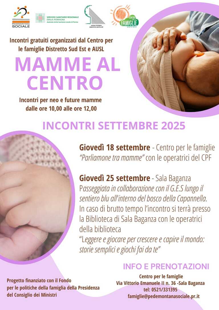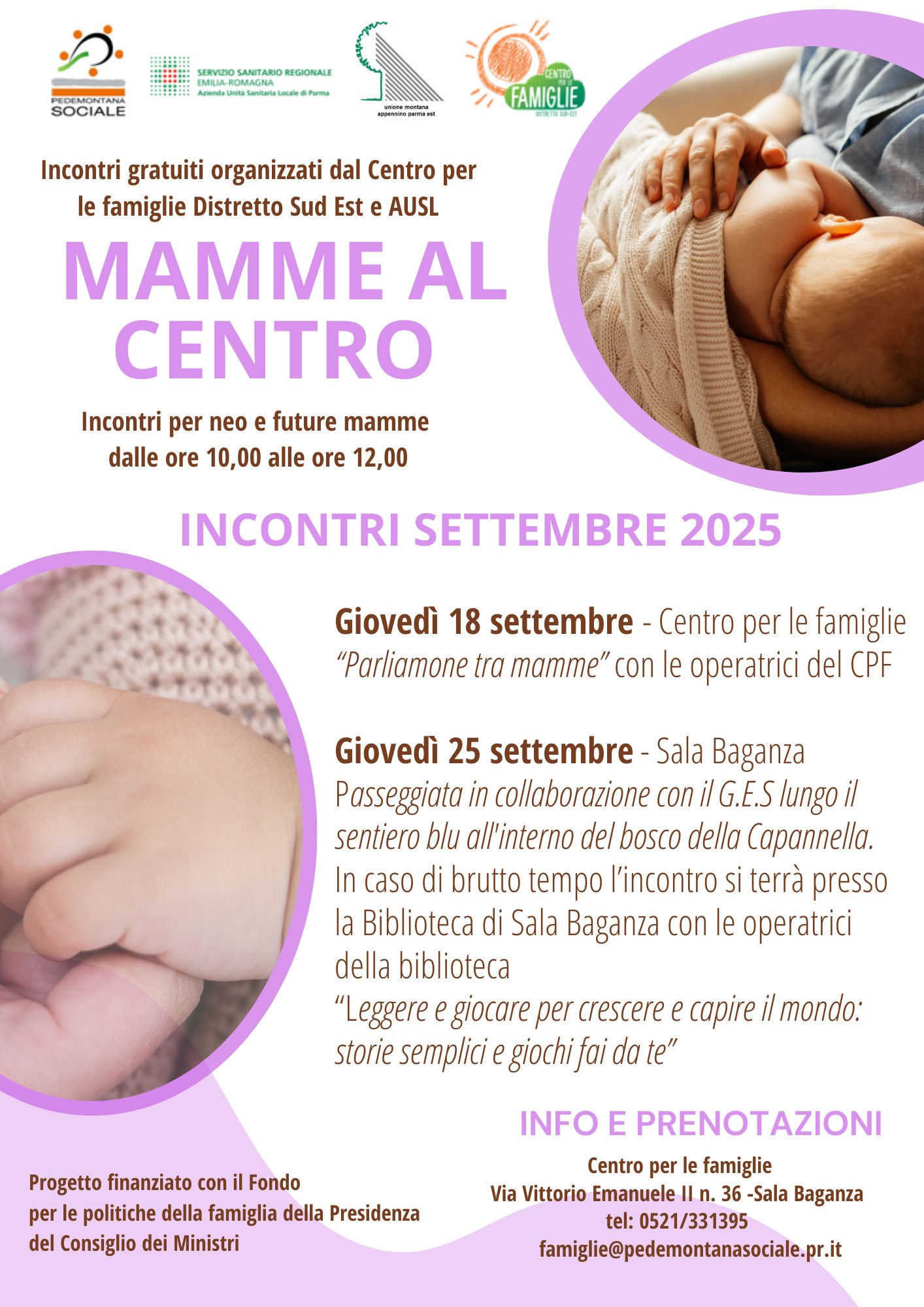 Le neo e future mamme si ritroveranno, come di consueto, il giovedì mattina dalle 10 alle 12. Il primo appuntamento “Parliamone tra mamme”, sarà giovedì 18 settembre al Centro per le Famiglie di Sala Baganza (Via Vittorio Emanuele II, 36) con le operatrici del CPF, mentre il secondo, giovedì 25 settembre, prevede una rilassante passeggiata nei Boschi di Carrega, realizzata in collaborazione con i volontari del Gruppo Escursionistico Salese (G.E.S.) lungo il sentiero blu all'interno del Bosco della Capannella. In caso di maltempo, è previsto un incontro alla Biblioteca comunale d Sala Baganza (P.zza Gramsci c/o Rocca Sanvitale) con le operatrici della biblioteca dal titolo 'Leggere e giocare per crescere e capire il mondo: storie semplici e giochi fai da te". Prossimamente riprenderanno anche gli altri tre percorsi: “Genitori al Centro”, “Papà al Centro” e “Adulti di casa”.