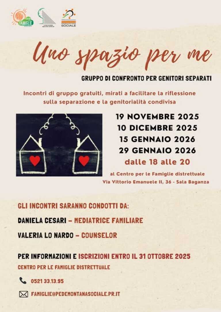 Si chiama “Uno spazio per me”, ed è un luogo dove incontrarsi e confrontarsi sotto la guida di esperti, dedicato ai genitori separati. Un percorso articolato in quattro incontri gratuiti che si svolgeranno dalle 18 alle 20 al Centro per le Famiglie del Distretto Sud Est di Sala Baganza (Via Vittorio Emanuele II, 36) e che prenderanno il via mercoledì 19 novembre 2025 e termineranno il 29 gennaio 2026, guidati da Valeria Lo Nardo, counselor del CpF, e dalla mediatrice familiare Daniela Cesari.