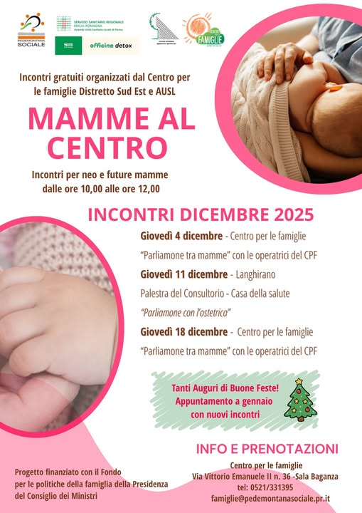 Ultimi appuntamenti del 2025 del percorso gratuito con esperti di “Mamme al Centro”, dedicato alle neo o future mamme che vivono nel Distretto Sud Est, nei 13 comuni dell’Unione Pedemontana Parmense e dell’Unione Montana Appennino Parma Est. Percorso che ha per obiettivo il sostegno alla genitorialità, finanziato dal Fondo per le politiche della famiglia della Presidenza del Consiglio dei Ministri, organizzato dal Centro per le Famiglie del Distretto Sud Est e Ausl in collaborazione con Azienda Pedemontana Sociale e Unione Montana Parma Est, che rientra tra le giornate “Officine detox” della Regione Emilia-Romagna.